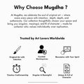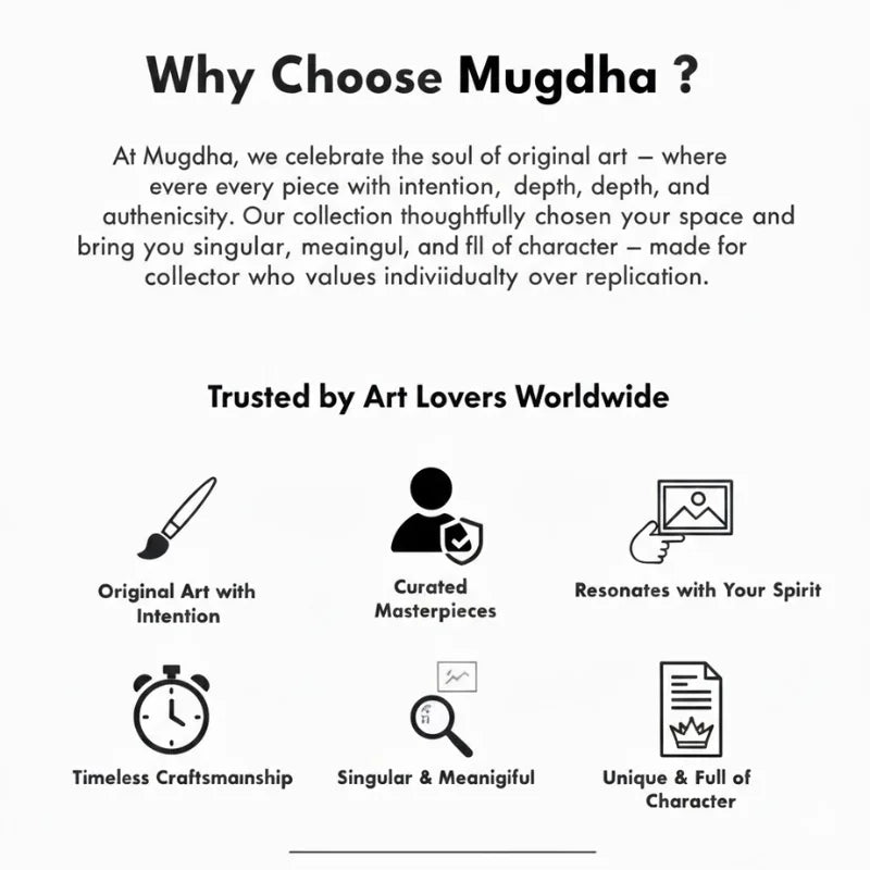 Each Mugdha artwork is an original, one-of-one creation thoughtfully curated to preserve authenticity and artistic integrity. Created using premium materials and traditional techniques, every piece carries emotional depth, cultural resonance, and timeless craftsmanship designed to transform refined living spaces.