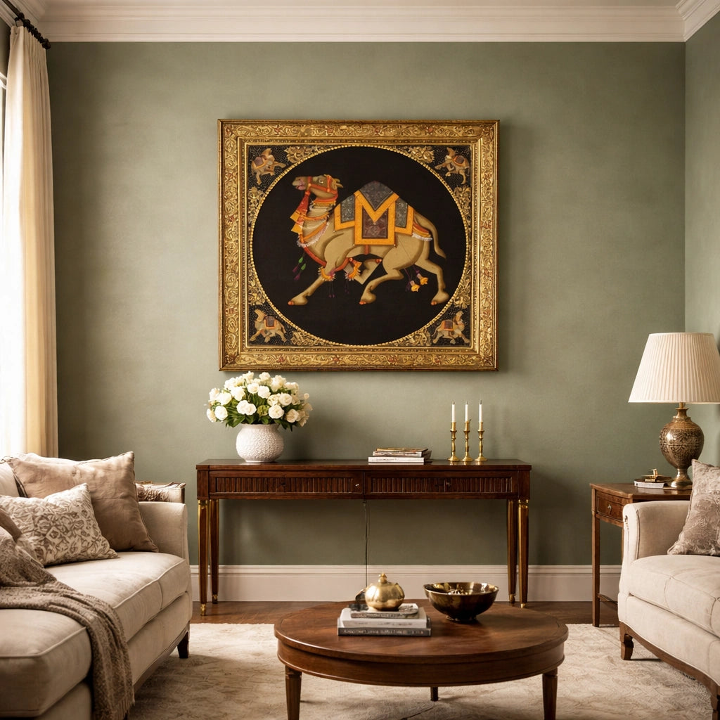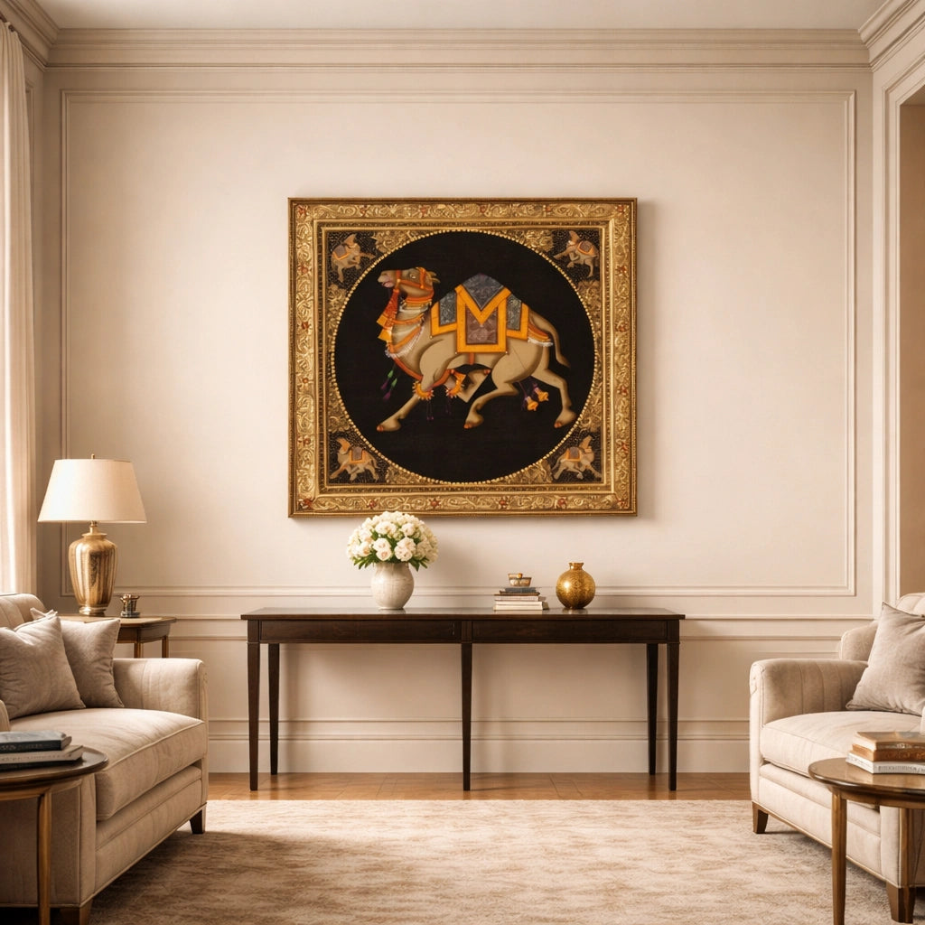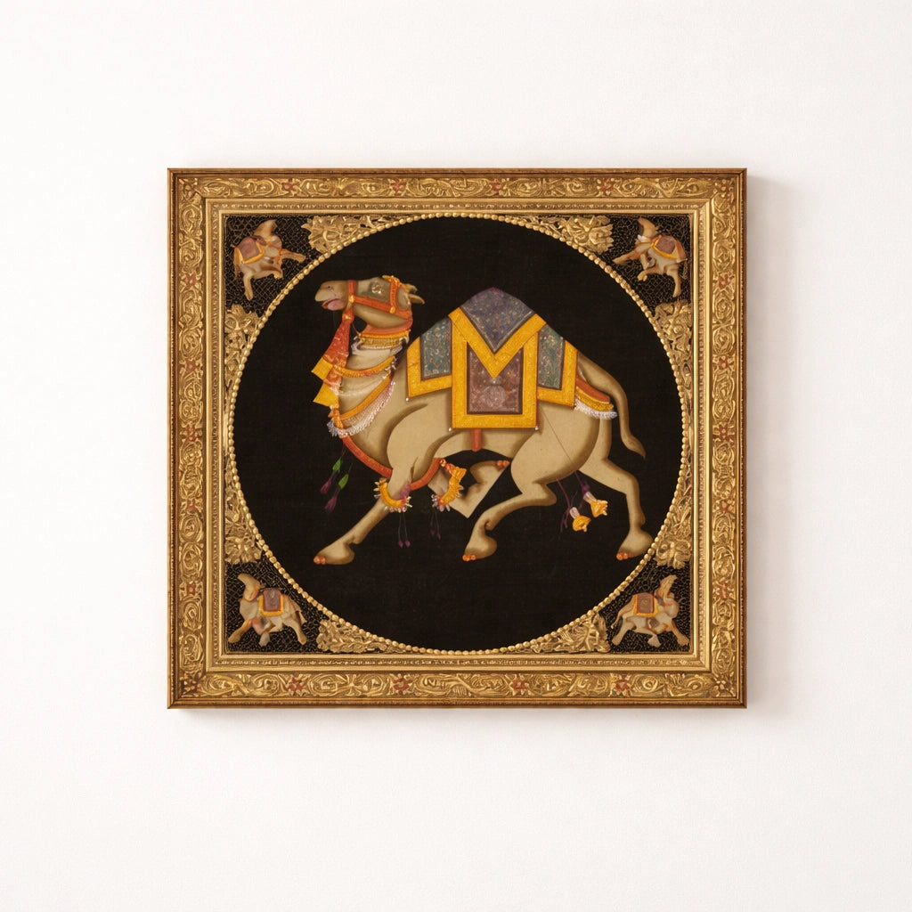 Royal Caravan – The Desert Grace is a heritage-inspired artwork rooted in classical miniature aesthetics. The central camel figure, adorned with intricate decorative elements, stands gracefully within a circular composition framed by detailed golden ornamentation.
